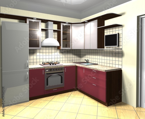 © zatelepina, Fototapeta premium 3D rendering interior design gray red kitchen