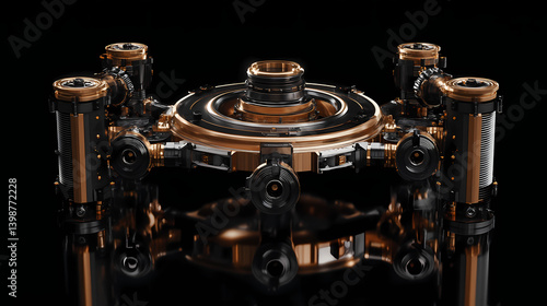 © Thiago, Fototapeta premium 3d rendering mechanical parts in shape of symbol of jupiter symbol isolated on black background with floor reflection. Lunar Forge. Illustration