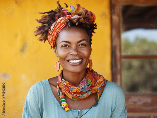 © Nataliia, Fototapeta premium 3d rendering of a beautiful African woman with gold and yellow toned clothing.