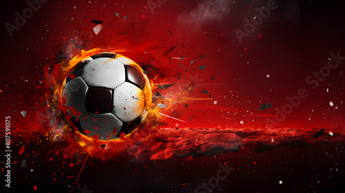 © Some, Fototapeta premium 3D rendering of a black and white soccer ball burning with hot flames on a red background under a spotlight background.