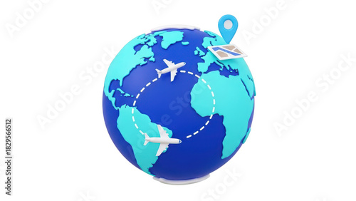 Fototapeta premium 3d rendering of a blue globe with airplane travel route and location pin, isolated on transparent background