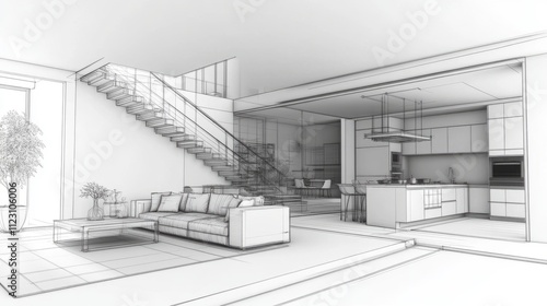 © Intach, Obraz premium 3D rendering of a contemporary homes open-plan kitchen and living room, complete with a sofa and stylish staircase, blending functionality and elegance