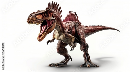 © Suphot, Obraz premium 3D rendering of a fierce dinosaur with sharp teeth and spiky back, isolated on a white background.