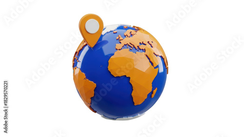 © Rehena, Fototapeta premium 3d rendering of a glossy blue and orange earth globe with a location pin marker placed on top, isolated on transparent background