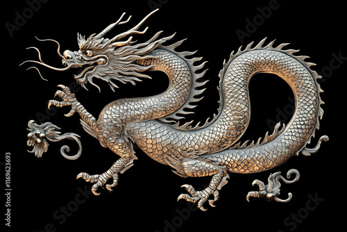 © nattawatstocker, Obraz premium 3D Rendering of a Gold Dragon in a Dynamic Pose with Intricate Details Against a Black Background