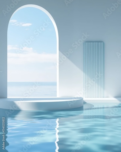 © YOASSATA, Fototapeta premium 3D rendering of a minimalist product display stage. The window displays a calm sky, a grooved glass panel on the right, and a reflection in the still water.