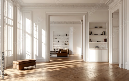 © saima bibi, Fototapeta premium 3D rendering of a modern living room interior with a wooden parquet floor and white wall mock-up, decorated with a cabinet, shelves with decorations, bookshelves, and a table in the front view