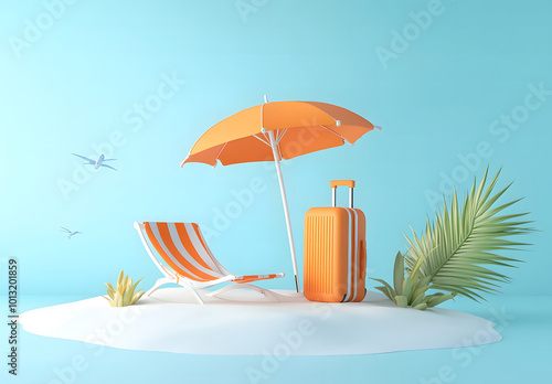 © Mahmud, Obraz premium 3D rendering of a summer vacation background with a beach umbrella, chair, and luggage on a white sand island design. Travel concept. Cartoon illustration design