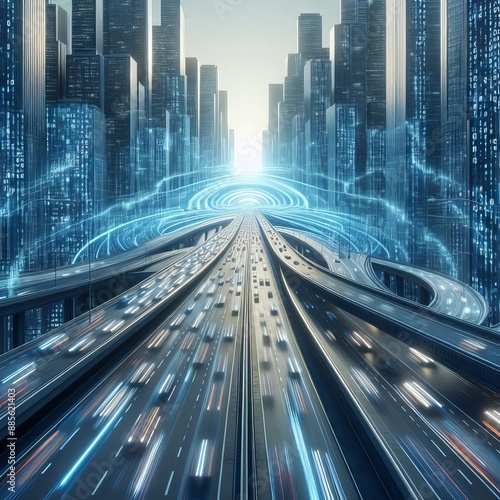 Fototapeta premium 3D Rendering of abstract highway path through digital binary towers in city.