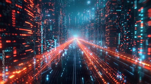 Obraz premium 3D Rendering of abstract highway path through digital binary towers in city....