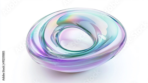 Obraz premium 3D rendering of an abstract futuristic shape resembling a clear contact lens, featuring an iridescent glass texture and pastel hues of blue, purple, green, and pink, floating on a white background.