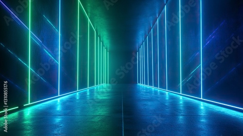 © Fathor, Fototapeta premium 3D rendering of blue and green neon light lines on a dark background with a floor for product presentation in an abstract style. Glowing scene with empty space. Abstract futuristic design for a show.