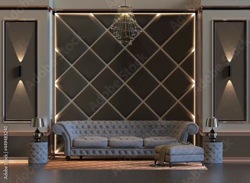 Naklejka premium 3d rendering of design interior living room with lamp and padded wall wall panel