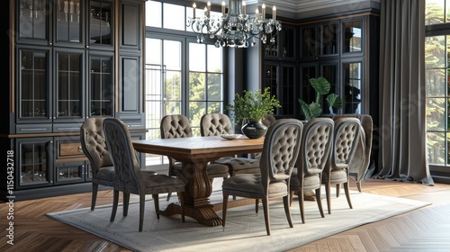 © Crck, Naklejka premium 3D rendering of elegant dining room with wooden table and stylish chairs