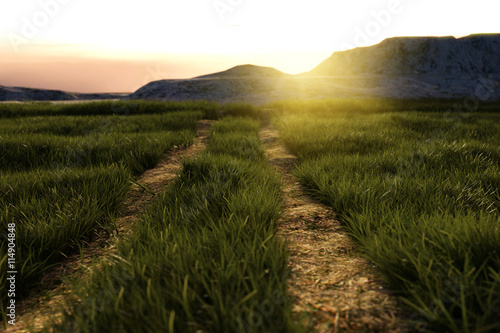 Obraz premium 3d rendering of footpath at high grassland in the evening sunshi