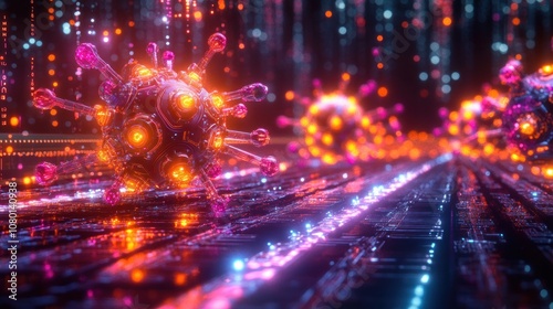 © ROY, Obraz premium 3D rendering of glowing virus cells on a futuristic digital background.