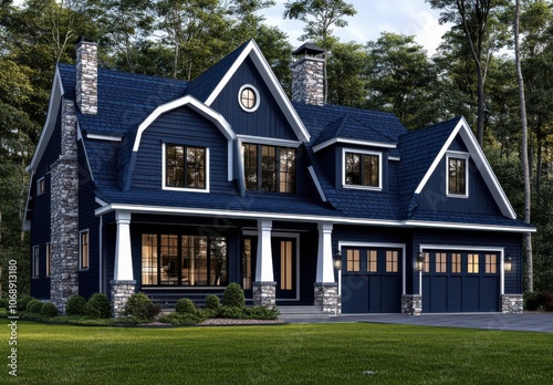© NusratJahan, Obraz premium 3D rendering of luxury modern farmhouse with navy roof and stone accents