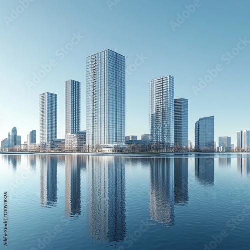 Fototapeta premium 3D rendering of modern city buildings on the water, with a clear blue sky...
