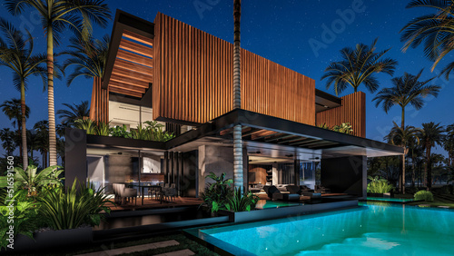 © korisbo, Obraz premium 3d rendering of modern cozy house with parking and pool for sale or rent with wood plank facade by the sea or ocean. Starlight night by the azure coast with palm trees and flowers in tropical island