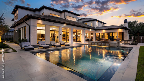 © Waqas, Fototapeta premium 3d rendering of modern cozy house with pool and parking for sale or rent in luxurious style and beautiful landscaping on background. Clear summer night with many stars on the sky.