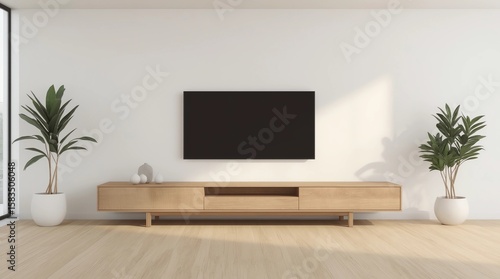© Khoira Studio, Obraz premium 3D rendering of modern living room with TV screen and sofa on nature background.