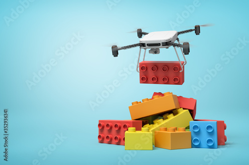 © gearstd, Fototapeta premium 3d rendering of quadcopter delivering huge red toy block and putting it on pile of other blocks on blue background.