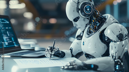 © fadi, Fototapeta premium 3D rendering of robot hominoid reading book, writing and solving math data analytics in concept of future mathematics artificial intelligence, data mining and 4th fourth industrial revolution .