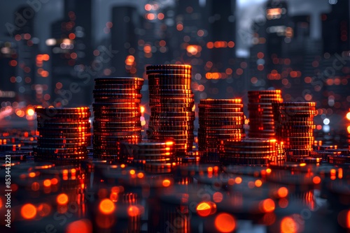 Obraz premium 3D rendering of stacks coins on city background, orange light, bokeh effect, high resolution photography