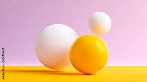 © Ashraf, Fototapeta premium 3D rendering of three white and yellow spheres floating on a flat background
