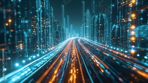 Fototapeta premium 3D Rendering of trail lights from highway and light reflection from buildings in mega city at night.