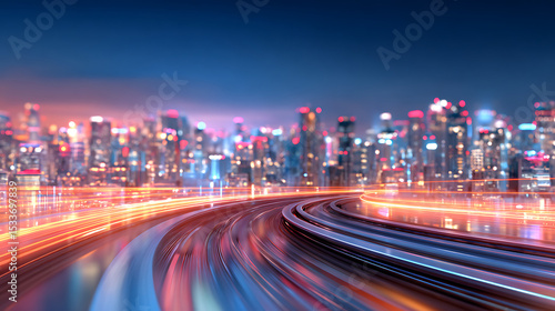 © THIBNH, Fototapeta premium 3D Rendering of warp speed in hyper loop with blur light from buildings' lights in mega city at night. Concept of next generation technology fin tech big data 5g fast network machine learni 40877274 1