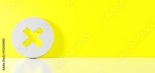 © Destrosvet, Fototapeta premium 3D rendering of white symbol of times circle icon leaning on color wall with floor reflection with empty space on right side