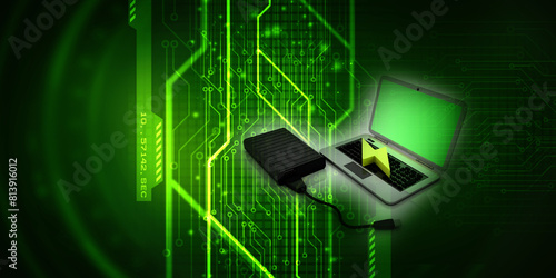 © jijomathai, Naklejka premium 3d rendering renewable energy sign with laptop near power bank