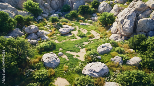 © share, Fototapeta premium 3D Rocky Landscape Illustration - Green Grass, Trees, and Boulders
