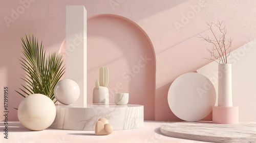 © Sun, Fototapeta premium 3d scene with abstract ball and pink background with white marble and vase. 3d render in the modern style.