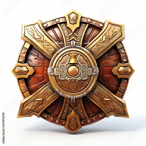 Naklejka premium 3D shield with a fantasy theme, including magical runes and symbols, isolated on white background