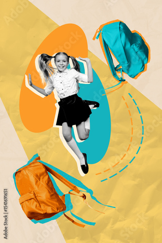 Obraz premium 3d sketch image vertical collage of happy schoolgirl jump rucksack supplies...