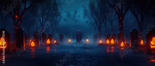 © FoxGrafy, Obraz premium 3D spooky graveyard with tombstones and glowing spirits, dark night