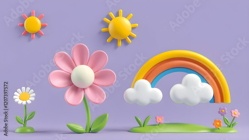 © Tark, Fototapeta premium 3d spring icons set. Blooming flower, sun and rainbow with clouds. Three dimensional warm summer weather vector objects. Toy plastic design elements collection. Generative AI