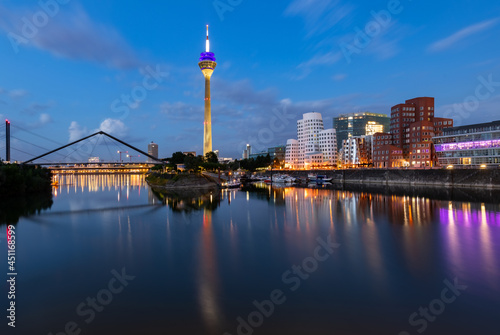 © ON-Photography, Naklejka premium Düsseldorf Hafen Rhein Deutschland NRW Fluss Blaue Stunde Stadt Skyline Abend Nacht Lichter Landeshauptstadt Fernsehturm Medien Brücke Altstadt Tourismus Panorama Stimmung Gebäude Architektur Kulisse