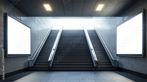 © Sehraye, Fototapeta premium 3d stairs going to light and empty white LCD screens for advertising on walls. Exit from underground or subway, staircase construction, ladder building architecture, Realistic vector illustration