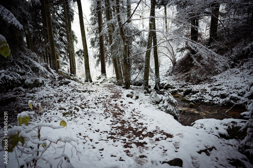© fotofrank, Fototapeta premium Düsterer Winterweg am Waldbach