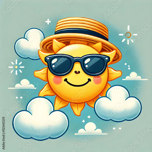 © Waris, Fototapeta premium 3D Sun Emoji Icon Isolated on White. Render Weather Sun Symbol. Sunlight Emoticon Yellow Cute Sunshine in Sunglasses. Weather, Climate Forecast. Concept of Summer Vacations. Face Vector Illustration