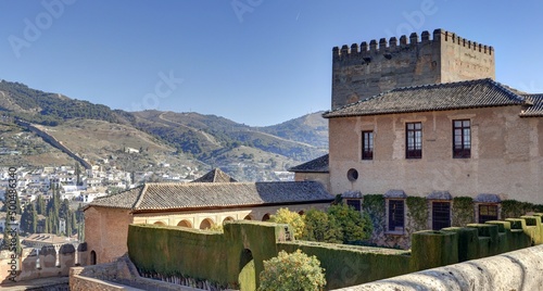 © Lotharingia, Obraz premium détail des jardins, façades et fontaines du palais de l'Alhambra en Andalousie dans le sud de l'Espagne