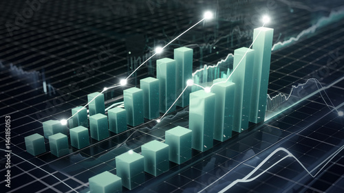 © Mirivox, Fototapeta premium 3D teal bar graph showcasing upward trend, symbolizing growth, success, and financial progress, ideal for business presentations or reports