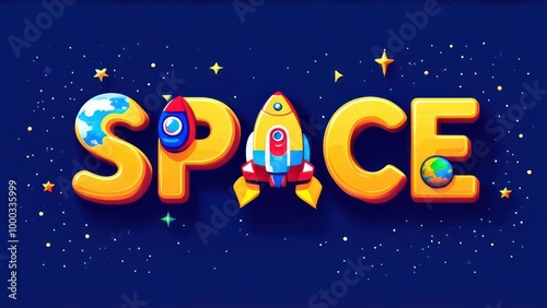 © Kateryna, Naklejka premium 3D text "Space" made of rockets, planets, and stars, on a deep blue background, in vibrant colors, with simple shapes, in a flat design, as digital art