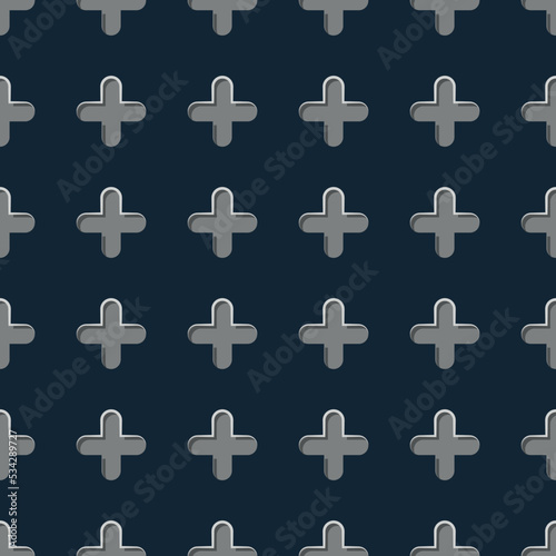 Fototapeta premium 3D texture seamless pattern. Grey plus sign repeat on black background. Cross shapes design. Vector illustration.