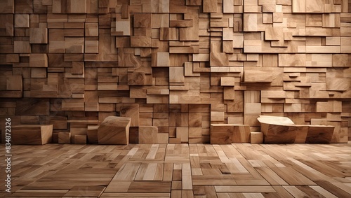 Fototapeta premium 3D Tiles arranged to create a Natural wall. Timber, Wood Background formed from Square blocks. 3D Render