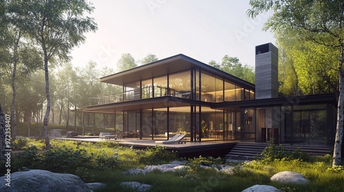 © Sinechana, Obraz premium 108. 3D visualization of a contemporary home, blending modern architecture with a serene natural landscape, highlighting expansive windows and a harmonious design