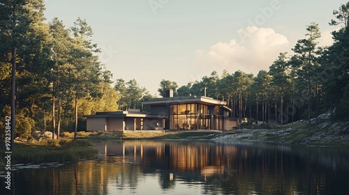 © Sinechana, Obraz premium 108. 3D visualization of a contemporary home, blending modern architecture with a serene natural landscape, highlighting expansive windows and a harmonious design
